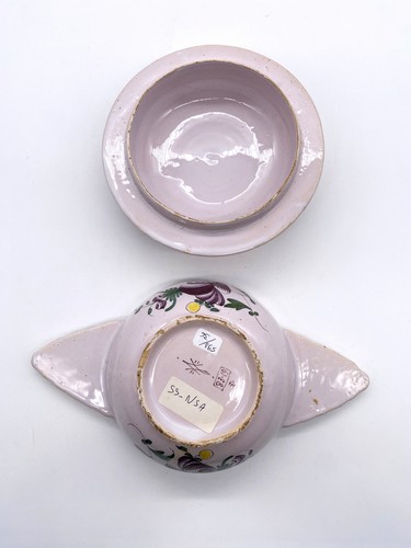 BOUILLON A OREILLES couvert, en faïence à décor polychrome de roses et renoncules. Marqué.