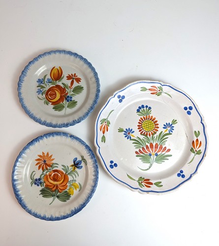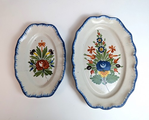 DEUX PLATS ovales et DEUX ASSIETTES à bord contourné, en faïence à décor émaillé polychrome de bouquets de fleurs et peignés bleus en bordure.
