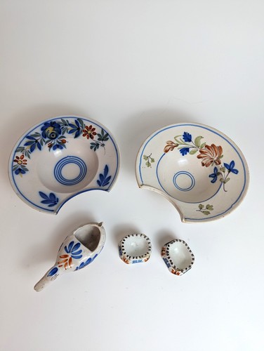 DEUX PLATS A BARBE, UN CANARD DE MALADE ET UNE PAIRE DE SALERON, en faïence émaillée polychrome à décor de bouquets de fleurs.
