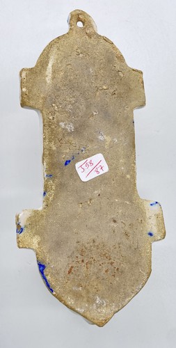BÉNITIER DE CHEVET en faïence à décor du Christ en croix, de l’inscription INRI en manganèse et de filets bleus.