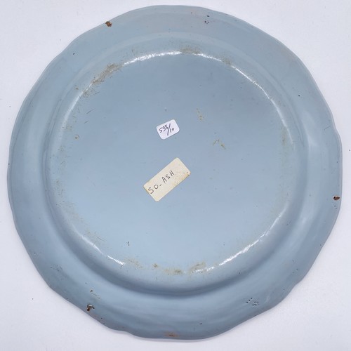 PLAT rond à bord contourné, en faïence à décor polychrome de bouquets symétriques de roses et pois de senteurs sur un émail gris-bleu.