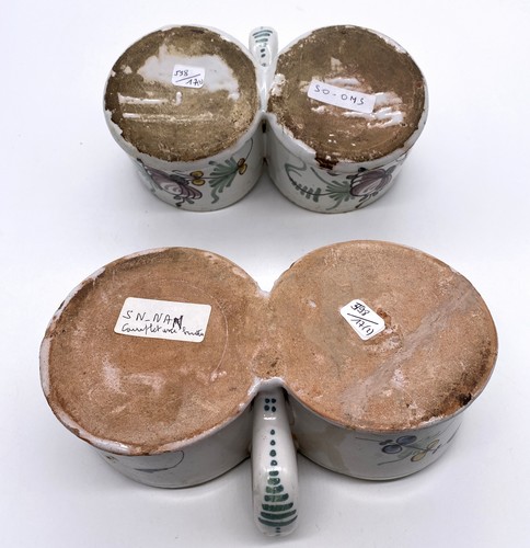 DEUX HUILIERS-VINAIGRIERS à une anse, en faïence à décor polychrome de fleurs et feuillage.