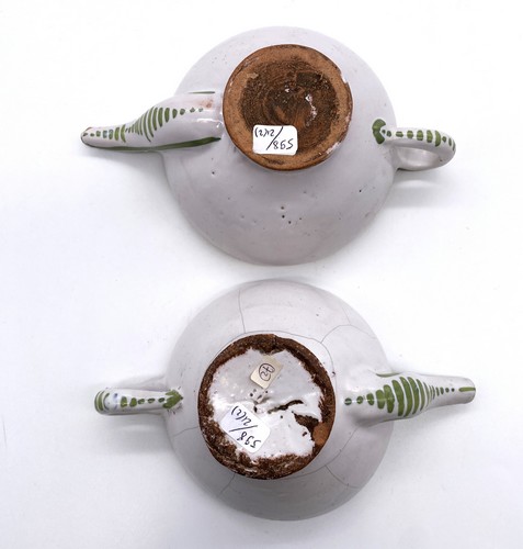 DEUX CANARDS DE MALADE en faïence, à décor polychrome de rose et fleurs de genets pour l'un, et renoncules bleues et fleurs de genets.