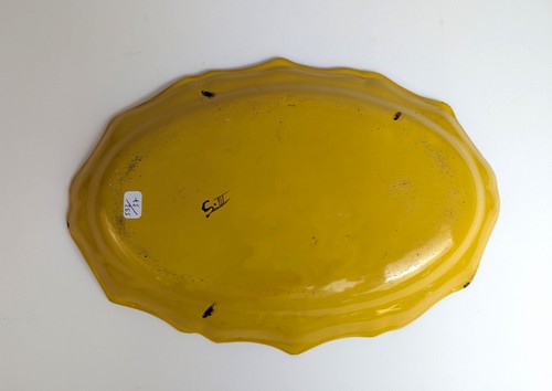 PLAT ovale à bord contourné en faïence émaillée de bouquet de roses et papillon sur fond jaune.