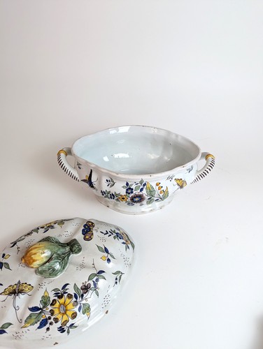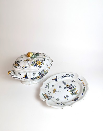POT A OILLE et SON PRESENTOIR, en faïence émailéle polychrome à décor de bouquets de fleurs, papillons et insectes.