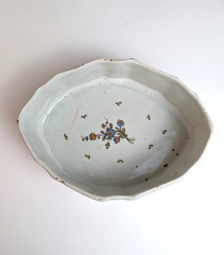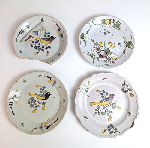 BANNETTE ovale, TROIS ASSIETTES à l'oiseau, et UNE ASSIETTE à décor de renoncule et pois de senteur, en faïence émaillée polychrome.