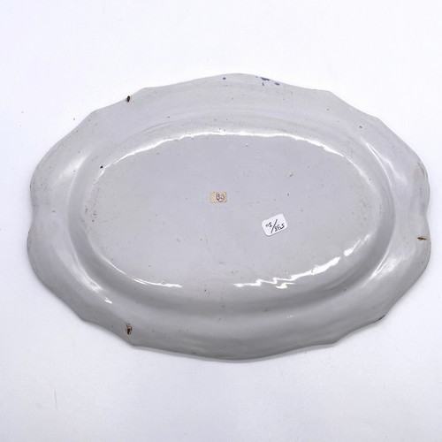 PLAT ovale à bord contourné, en faïence à décor polychrome de renoncules et fleurs de genet, fougères sur l'aile.