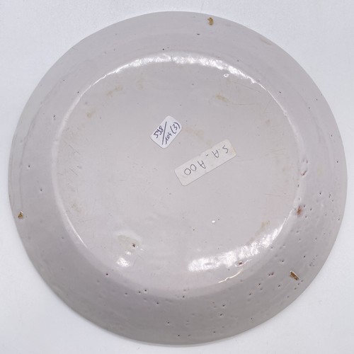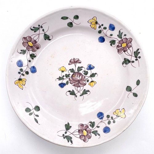 DEUX ASSIETTES dont une à bord contourné, en faïence à décor polychrome de bouquets symétriques de roses et pois de senteurs.