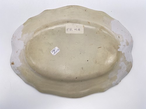 PLAT ovale à bord contourné, en faïence à décor polychrome de bouquet de rose et renoncules décentré.