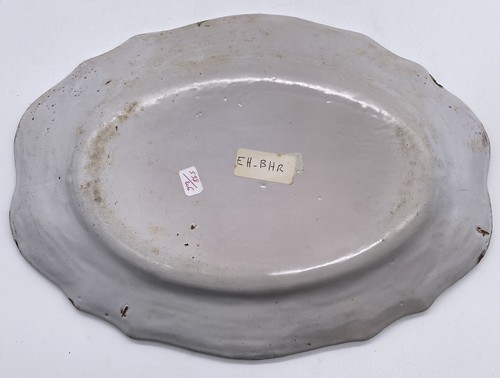 PLAT OVALE à bord contourné, en faïence à décor et camaïeu vert d'une palombe sur une terrasse feuillagée, deux terrasses sur l'aile.