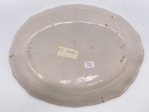 PLAT ovale à bord contourné en faïence à décor polychrome au centre d'une femme debout sur une terrasse fleurie tenant une canne avec panier en osier, un autre à ses pieds.