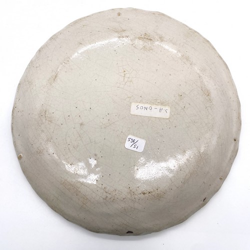 ASSIETTE à bord contourné, en faïence à décor polychrome au centre d'un couple debout sur une terrasse fleurie, tertres fleuris sur l'aile.