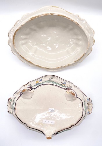 TERRINE ovale couverte de forme contournée, en faïence, reposant sur trois pieds, les anses latérales en forme de corde tressée, la prise du couvercle en forme de poire, et à décor polychrome de personnages animés sur des terrasses fleuries.