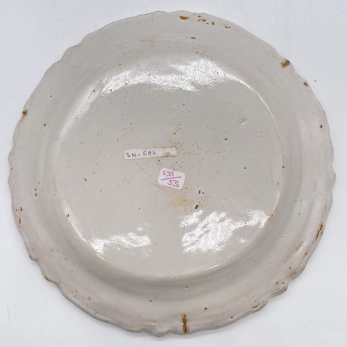 ASSIETTE à bord contourné à decor polychrome au centre d'une femme debout avec chapeau et panier sur terrasse.