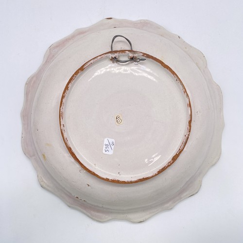 PLAT creux rond à bord contourné, en faïence à décor en camaïeu orangé au centre d'un bouquet de fleurs et sur l'aile de mofifs de dentelles et rinceaux feuillagés.