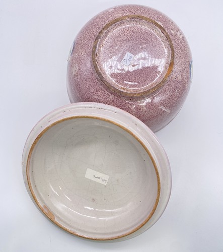 SOUPIERE ronde couverte, en faïence à décor polychrome de tiges fleuries dans des réserves quadrilobées cernées d'un filet bleu sur fond manganèse posé à l'éponge.