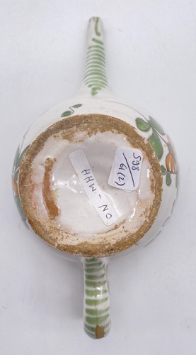 DEUX CANARDS DE MALADE en faïence, à décor polychrome de bouquets de fleurs et de la lettre T en manganèse entre deux feuilles pour l'un, peignés sur le déversoir et l'anse.