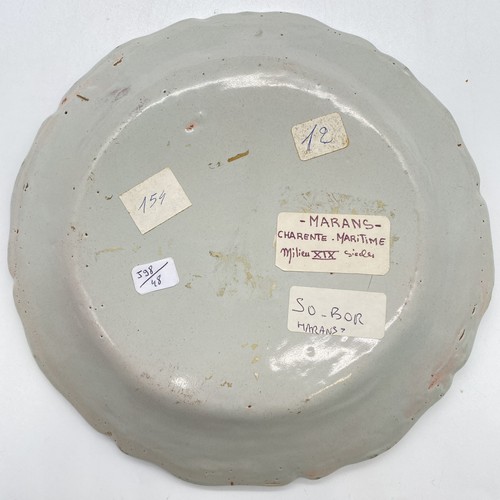 ASSIETTE à bord contourné, en faïence à décor manganèse et vert au centre d'un œillet et filet sur l'aile.