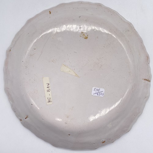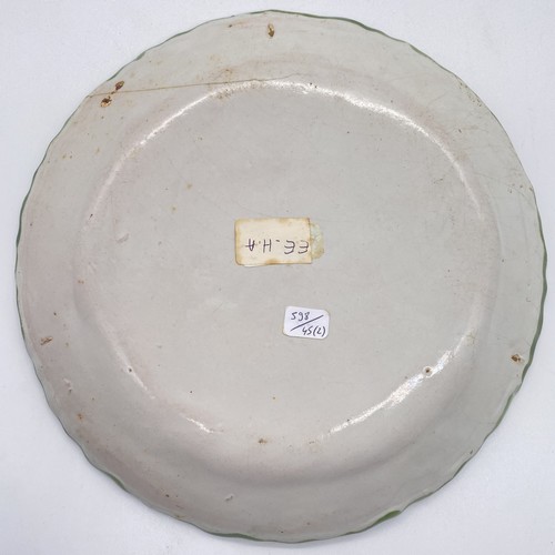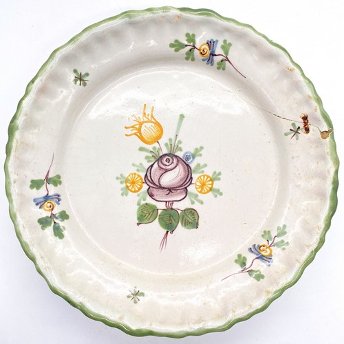 DEUX ASSIETTES à bord festonné, en faïence à décor polychrome au centre d'un bouquet de fleurs formé d’une rose en manqganèse et fleurettes pour l'une, l'autre à filet vert en bordure attribuée à la Manufacture de Boyer