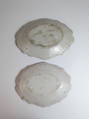 DEUX PLATS ovales à bord contourné, en faïence à décor émaillé manganèse et vert d'un bouquet au trois roses, bordure à guirlande manganèse et filet vert.