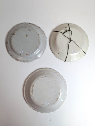 TROIS ASSIETTES à bord contourné en faïence émaillée vert et manganèse à décor à la levrette.