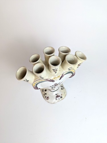 TULIPIERE à huit becs sur piédouche, en faïence émaillée polychrome de branches fleuries et rinceaux.