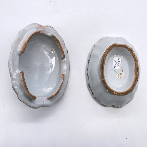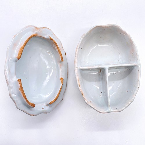 BOÎTE A ÉPICES couverte à trois compartiments, en faïence à décor polychrome de guirlandes de fleurs. Prise en bouton de fleur.