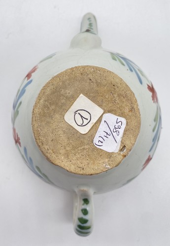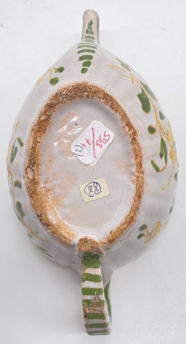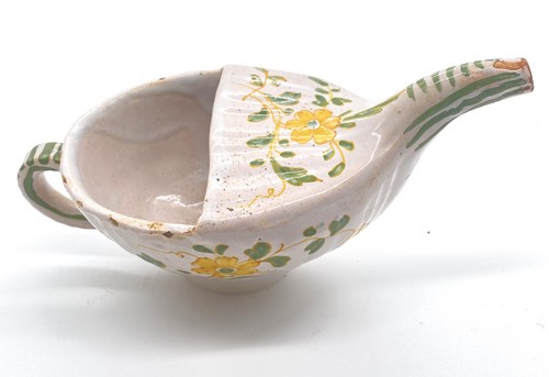 DEUX CANARDS DE MALADE en faïence à décor vert et ocre jaune de bouquets de fleurs et peignés pour l'un, et de guirlandes d'œillets rouges pour l'autre.