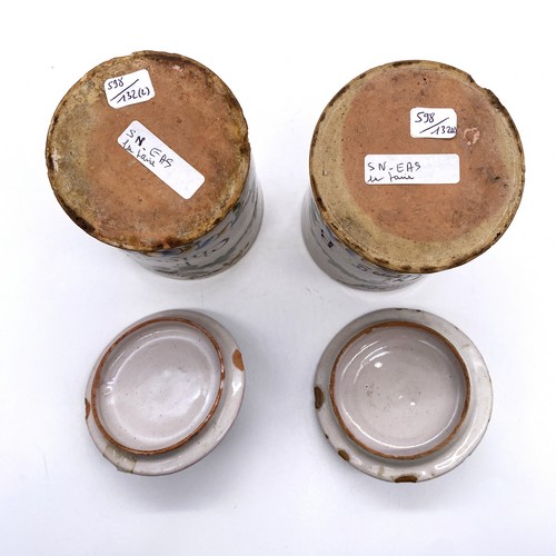 PAIRE DE POTS DE PHARMACIE cylindriques et couverts, en faïence décor polychrome, l'un avec inscription "Pil H drag. B." et l'autre "Ex Chicorii" dans un cartouche cerné de rinceaux de fleurs stylisées.
