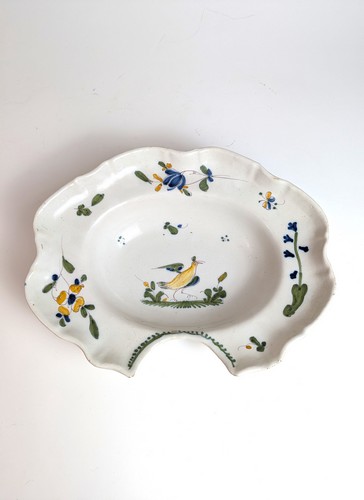 PLAT A BARBE en faïence à décor émaillé polychrome d'un oiseau sur terrasse dans le bassin et branchages fleuris sur l'aile.
