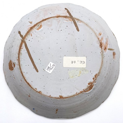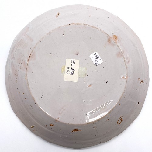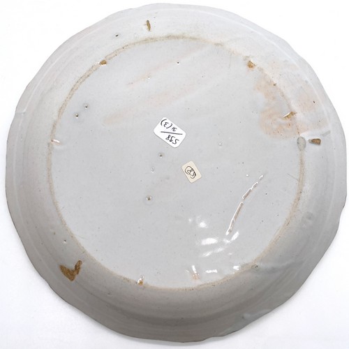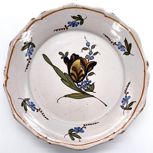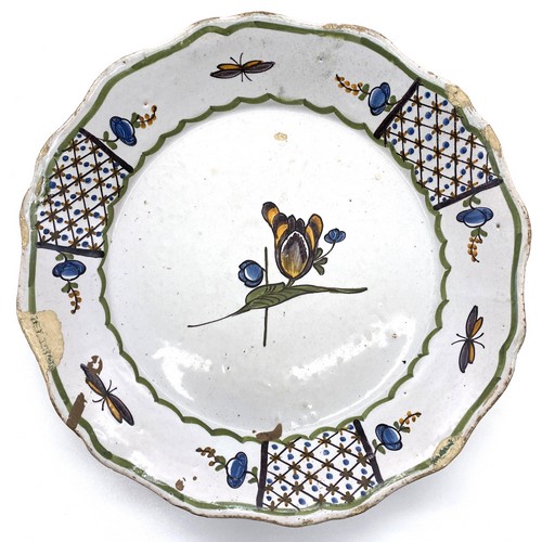 TROIS ASSIETTES à bord contourné, en faïence à décor polychrome au centre d'une tulipe, et sur l’aile de papillon et réserves à croisîllons ou branchages, la troisième à décor de fleurs décentrées, insecte et baies.