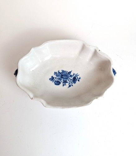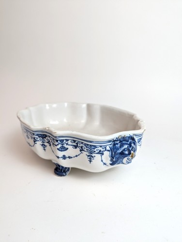 CORBEILLE (ou corps de POT A OILLE) à bord contourné, en faïencé émaillée en camaïeu bleu d'un bouquet de fleurs de solanée dans le fond, l'extérieur à firise de rinceaux et anses en mascaron de grotesque. Quatre petit pieds à décor de rinceaux.