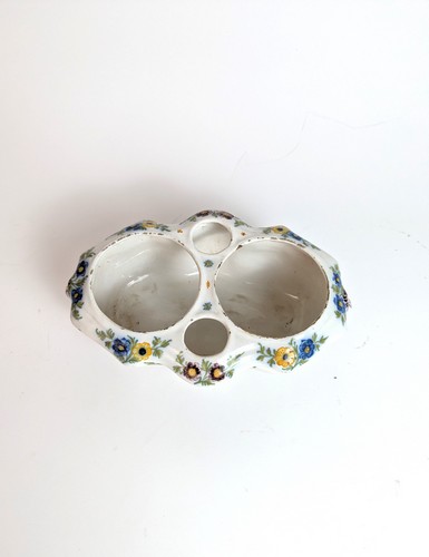 HUILIER-VINAIGRIER à bord contourné en faïence émaillée polychrome de fleurs, anses en mufles de lion et reposant sur trois pieds.