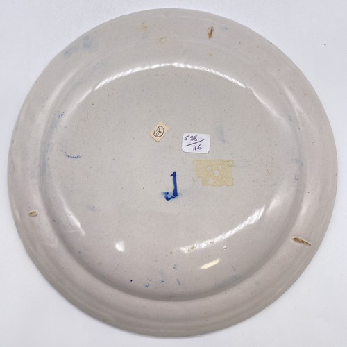 ASSIETTE en faïence à décor en camaïeu bleu de deux chinoises sur une terrasse rocheuse avec insectes. Marque en bleu au revers.