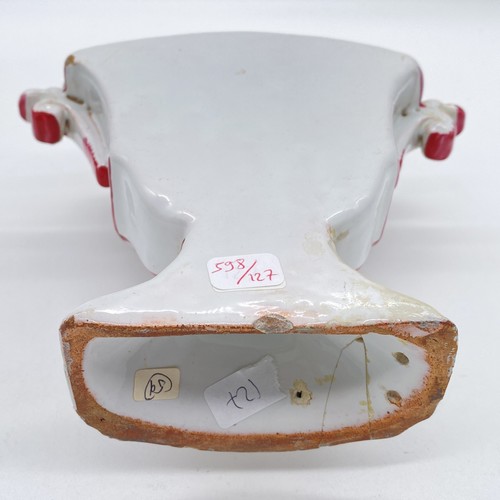 TULIPIERE en faïence à quatre tubulures, à décor polychrome de bouquets de fleurs nouées.