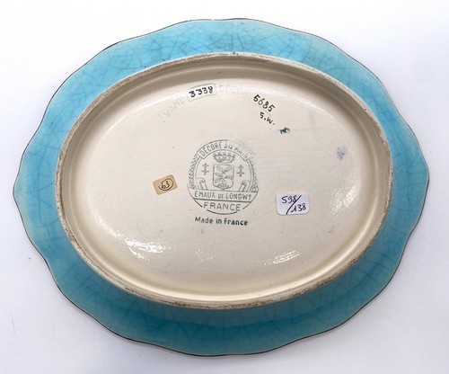 CORBEILLE en faïence à bord contourné à décor émaillé polychrome d'oiseaux branchés au centre sur fond de branchages fleuris sur fond bleu.