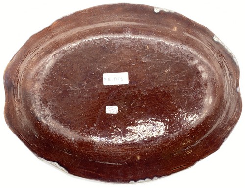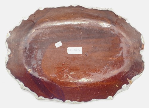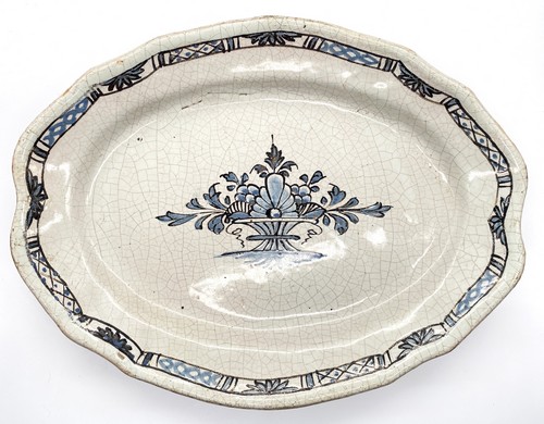 DEUX PLATS "cul noir" de forme chantournée, en faîence à décor en camaïeu bleu au centre d’un panier fleuri et sur l’aile d'un galon à croisillon.