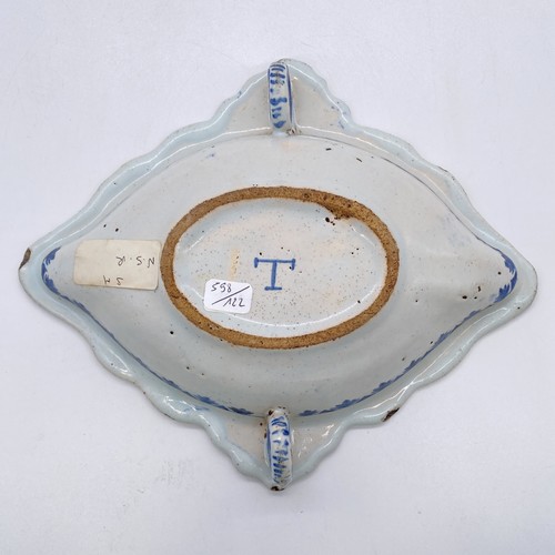 SAUCIERE ovale à bord contourné et deux anses annulaires couvertes, en faïence à décor polychrome au centre d'un panier fleuri et sur le bord d'un galon à rinceaux sur fond bleu.Marque de peintre T en bleu.