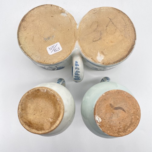 HUILIER-VINAIGRIER et DEUX BURETTES en faïence à décor bleu et manganèse de rinceaux feuillagés.