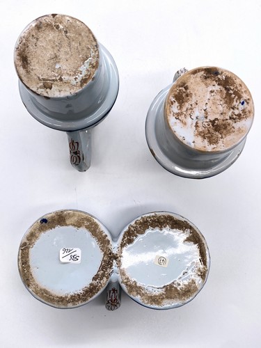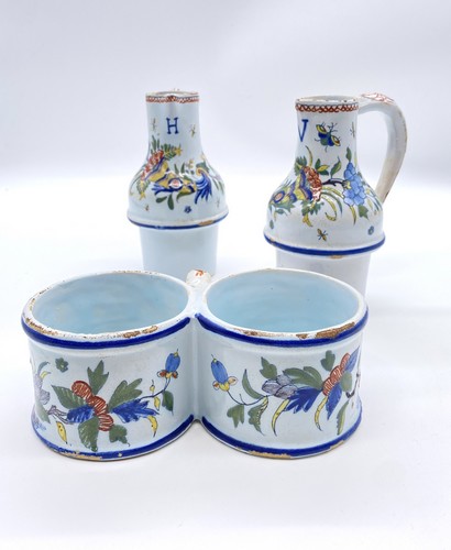 HUILIER-VINAIGRIER ET SES DEUX BURETTES, en faïence à décor polychrome à la corne d'abondance.