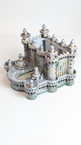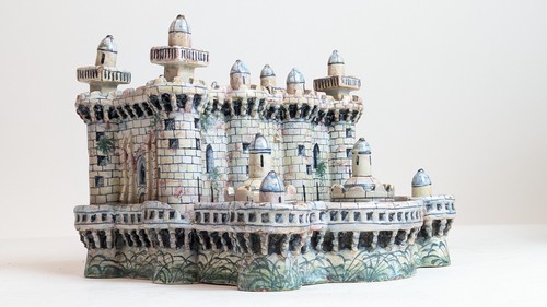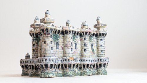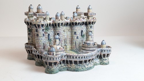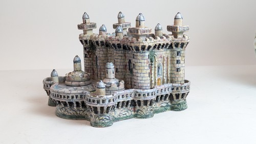 ENCRIER rectangulaire en faïence émaillée polychrome à forme évoquant la forteresse de la Bastille comprenant deux encriers couverts. L'enceinte de la forteresse formant casier ou porte-enveloppe.