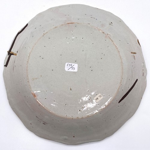 ASSIETTE à bord contourné, en faïence à décor polychrome au centre de deux fruits dans un médaillon et sur l'aiie d'un galon.