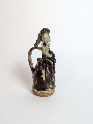 VERSEUSE anthropomorphe en grès vernisé brun et vert figurant une femme en tenu traditionnelle tenant le bec verseur entre ses mains.