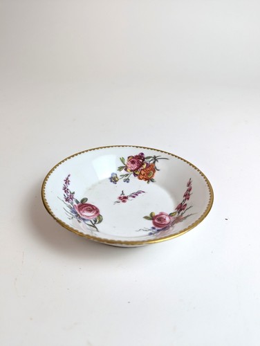 SOUCOUPE en porcelaine tendre à décor de bouquets de fleurs au naturel, bordure dorée.
