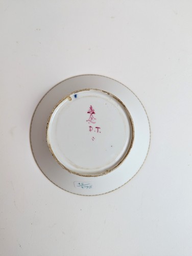 Marques en rose aux LL entrelacés sous couronne, lettre date y et initiales de peintre D.T. attribuées à peintre Nicolas Dutenda, actif de 1765 à 1788.