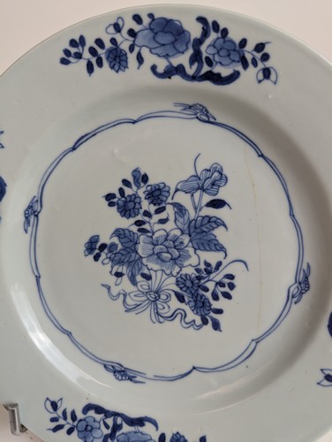 CINQ ASSIETTES en porcelaine émaillée blanc-bleu, à décor de bouquets de fleurs noués dans un filet au centre, l'aile à décor de quatre branchages fleuris.