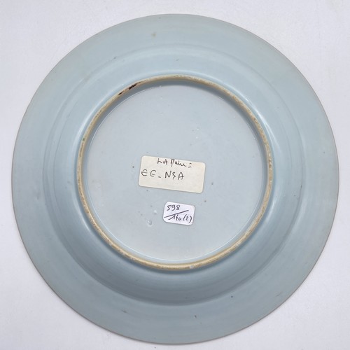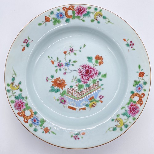 PAIRE D'ASSIETTES creuses en porcelaine, à décor polychrome des émaux de la famille rose de jardinières fleuries.