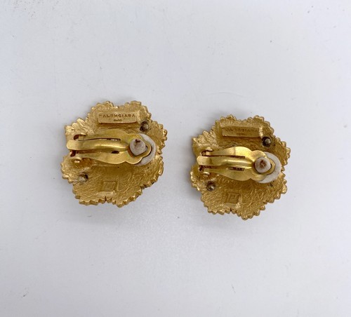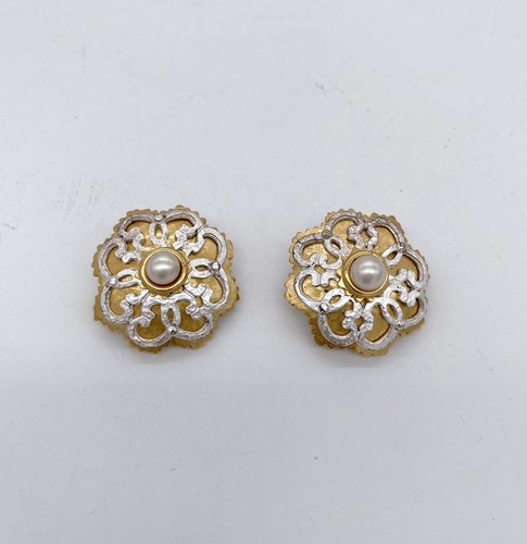 PAIRE DE CLIPS D'OREILLES fantaisie en métal doré et laqué gris, de forme fleur avec rinceaux centrés d'une perle fantaisie. Signés.