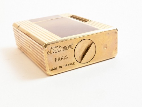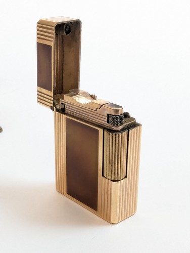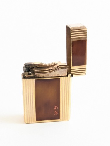 BRIQUET en métal doré cannelé et laque brune deu Japon, signée.