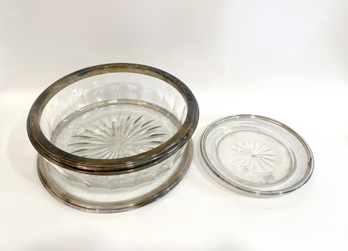 SALADIER, DESSOUS-DE-PLAT et COUPELLE en verre taillé de palmettes et godrons, monture en argent (950).